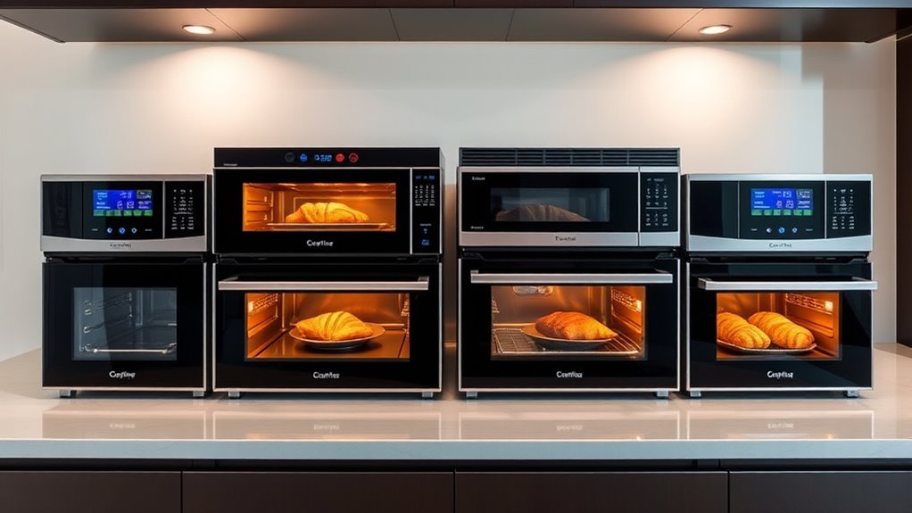 These advanced countertop ovens are surprisingly energy-efficient, especially considering their versatility. I’ve noticed they use less power than traditional ovens because they heat up quickly and cook faster. Plus, their combination of microwave and convection features helps save energy by reducing cooking time. If you’re mindful of energy use, these appliances are a smart choice for gourmet cooking at home, delivering great results without excessive power consumption.