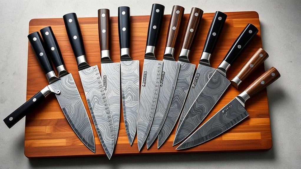 A comfortable, well-designed handle is indispensable for safe and efficient food preparation in a halal kitchen. Ergonomically shaped handles provide a comfortable grip that reduces hand fatigue during long tasks. Materials like pakkawood or reinforced resin not only look attractive but also resist moisture, which is essential for maintaining hygiene. The right handle shape and size ensure a secure hold, even when your hands are wet or greasy, preventing slips. Balanced handle weight enhances control, making slicing and dicing safer and more precise. Handles with natural textures or layered reinforcement improve grip stability, which is critical when handling halal ingredients. Overall, prioritizing ergonomic handles helps boost safety, comfort, and efficiency in your kitchen.