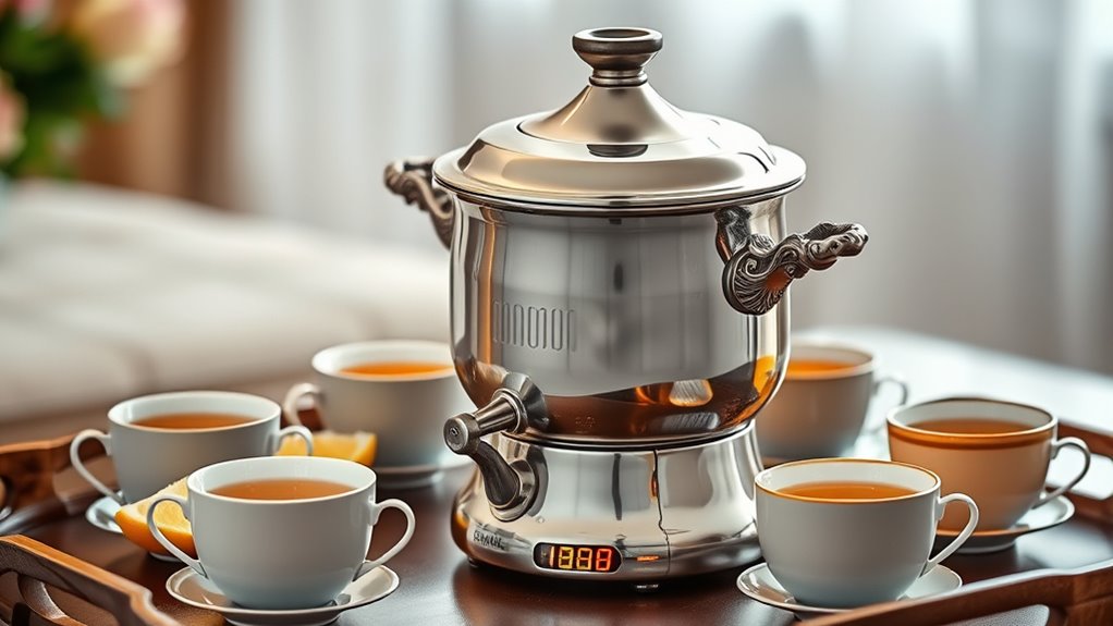 Advanced heating technology plays a crucial role in guaranteeing your large electric samovar heats water efficiently and safely. Many models feature concealed stainless steel elements that rapidly boil water within minutes, saving time. Thermostats and digital temperature controls allow precise heat adjustments, perfect for brewing different types of tea. Modern samovars also include overheat and boil-dry protection, preventing accidents and extending device longevity. Some models automatically switch between boiling and keep-warm modes, which conserves energy while keeping tea ready to serve. High-wattage heating elements, usually between 900W and 1300W, enable quick heating and reboiling of large water volumes. Overall, advanced heating technology ensures fast, consistent, and safe operation, making your tea experience more convenient and enjoyable.