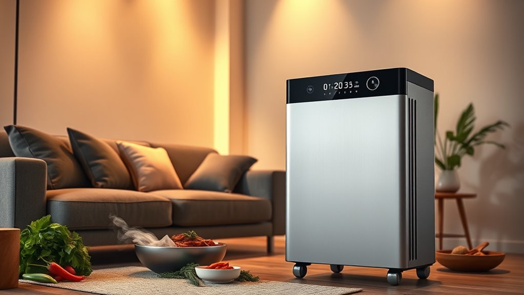 Think of it like a chef perfecting a dish—additional features can truly elevate odor removal. I recommend looking for purifiers with activated carbon filters, which act like a sponge for smells, and those with smart sensors that automatically adjust for air quality. Some models even have UV sterilization to eliminate germs, making your space not just smell better but healthier. These extras make a real difference in large rooms.