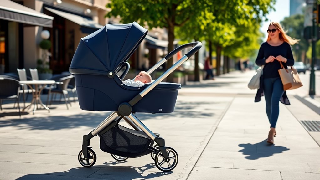 Lightweight travel systems aren’t typically designed for rough terrains. I’ve found that they’re best suited for urban environments, smooth sidewalks, and quick errands. When I need to tackle uneven paths or trails, I prefer sturdier, all-terrain strollers with larger wheels and better suspension. For easy city trips, though, a lightweight system makes everything simpler and more manageable. Always consider your terrain before choosing a stroller to guarantee safety and comfort.