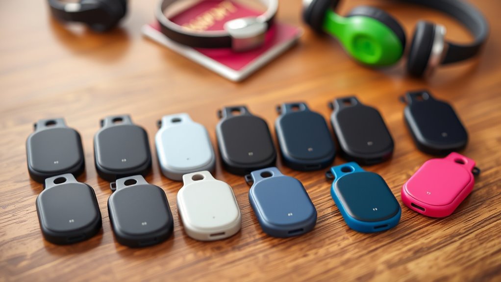Choosing the right size and attachment options for a Bluetooth luggage tracker is essential for guaranteeing it stays securely connected and easy to carry. Compact models, around 1.1 to 1.5 inches, are most versatile, fitting easily on luggage, backpacks, or wallets without adding bulk. Lightweight trackers reduce discomfort and prevent damage to your belongings. When it comes to attachment methods, key rings, adhesive pads, or lanyards make securing the tracker straightforward and adaptable to different items. The material and size of your belongings influence your choice—smaller, slim trackers work best for tight spaces, while larger ones might offer more durability but can be less discreet. Ultimately, selecting a tracker with the right size and attachment features ensures durability, convenience, and peace of mind during travel.