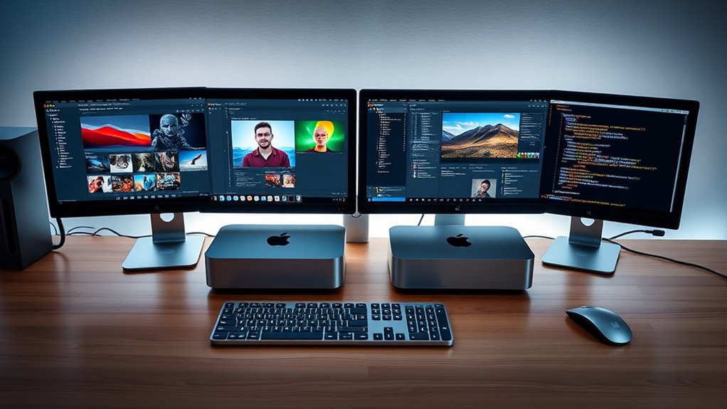When selecting a Mac Mini for creative work, it’s vital to guarantee it can support your desired display setup. You need to verify that the Mac Mini can handle the resolution and refresh rate of your monitors, whether 4K, 5K, 6K, or even 8K. Check that its HDMI and Thunderbolt 4 ports can support multi-display configurations with the needed resolutions and color accuracy, especially for HDR formats like Dolby Vision or HDR10+. Some models support up to three monitors simultaneously, which is essential for multi-screen workflows. Finally, confirm the graphics capabilities are robust enough to drive your displays smoothly, without lag or resolution limitations. Meeting these criteria guarantees a seamless, high-quality visual experience tailored to your creative needs.