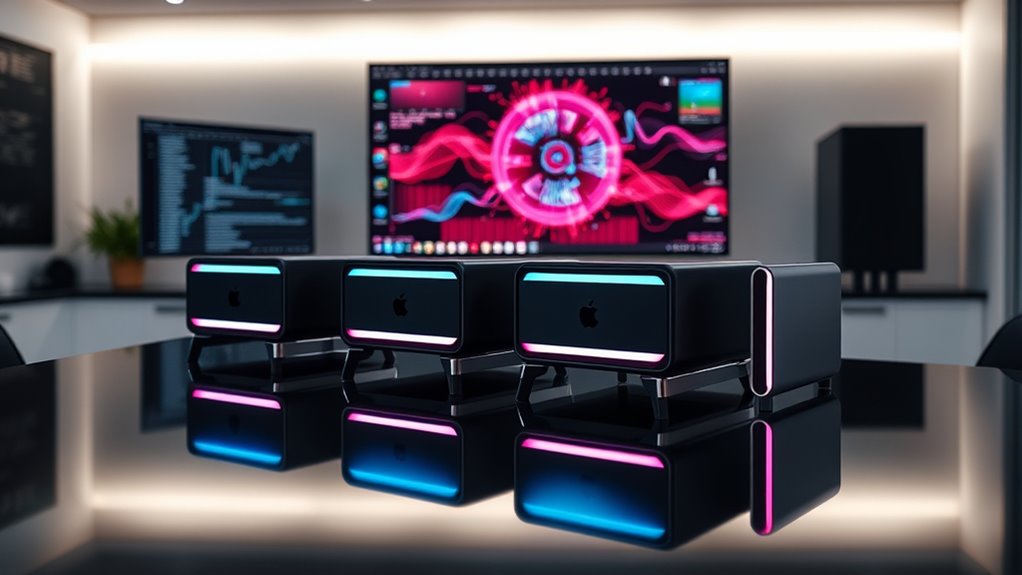 Choosing a Mac Studio for machine learning hinges on understanding its processing power capabilities, as tasks like training models and making predictions demand significant computational resources. Multi-core CPUs are indispensable for faster training and inference, so look for models with high core counts. GPUs with large core counts and specialized architectures dramatically accelerate deep learning workloads compared to standard CPUs. The number of CPU and GPU cores directly impacts how quickly you can process complex models. Additionally, sufficient memory bandwidth and high-performance media engines are vital for handling large datasets and model parameters efficiently. For maximum results, select a Mac Studio with a powerful CPU, dedicated GPU, and ample unified memory tailored to your machine learning needs. These elements combined ensure maximum speed and efficiency during intensive workloads.