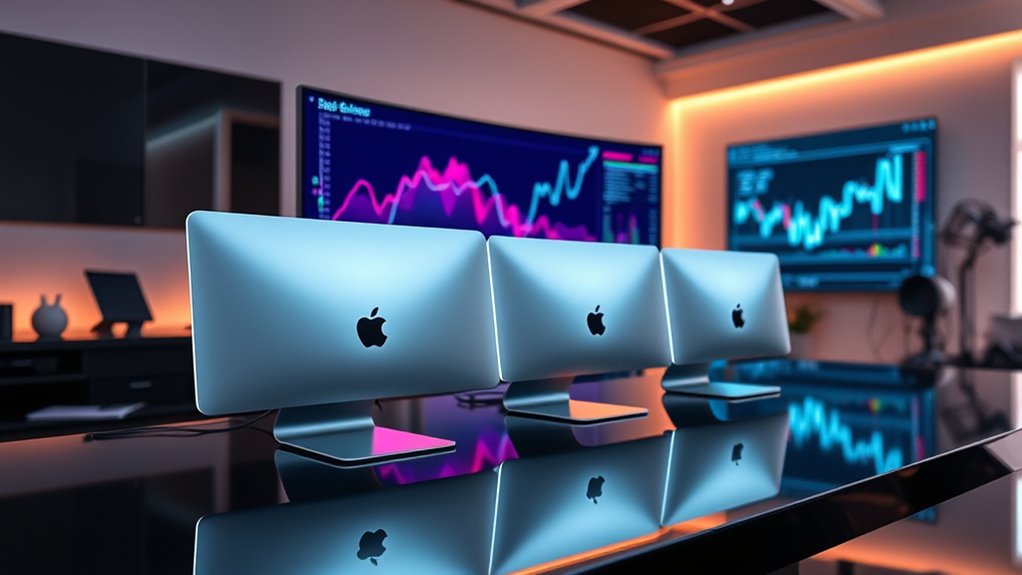 Evaluating your performance needs is essential to selecting the right Mac Studio with 2TB+ storage, especially since high-performance tasks like 4K video editing, 3D rendering, or large data processing demand robust CPU and GPU power. I consider whether my workflow involves intensive applications that leverage hardware acceleration, such as media engines or ray tracing, which influence the hardware specs I need. I also check if my storage requirements surpass 2TB due to large media files or extensive project archives, affecting my choice of configuration. Additionally, I assess if my tasks require high memory bandwidth for smooth multitasking. Understanding these factors helps me identify whether a more powerful CPU, GPU, or increased RAM is necessary to ensure my Mac Studio can handle demanding workloads efficiently.