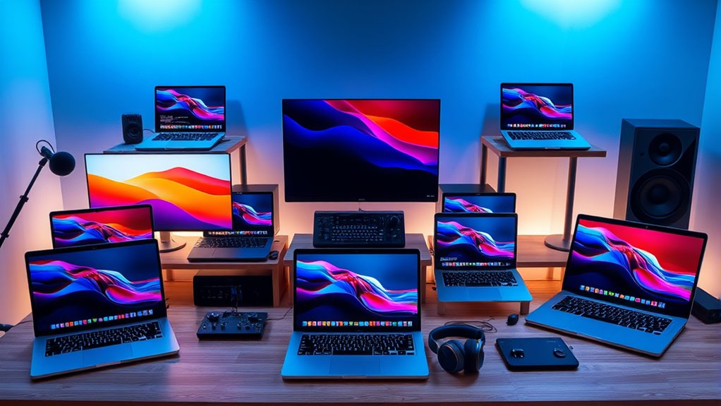 Since Apple’s ecosystem is designed for seamless integration, selecting a MacBook Pro for music production means you’ll benefit from effortless connectivity and workflow. Compatibility across MacBook, iPhone, iPad, and other Apple devices allows smooth sharing of files, projects, and apps. Features like iPhone Mirroring and message sharing make controlling and collaborating on music projects easier. Support for AirPods and high-impedance headphones ensures top-tier audio monitoring, vital for professional work. macOS also offers native support for popular music software like Logic Pro and Ableton Live, guaranteeing smooth operation. Additionally, quick transfer of audio files via AirDrop and iCloud streamlines your workflow, reducing downtime and frustration. This interconnected environment helps keep your creative process fluid and efficient, making the MacBook Pro a compelling choice for music producers.