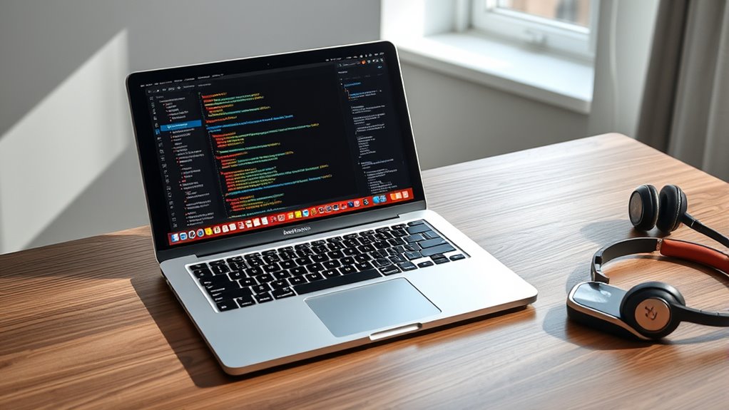 The display quality and size of a MacBook Pro considerably impact your workflow as a developer. A larger screen, like 16.2 inches, offers more space for coding, debugging, and multitasking, boosting productivity. The high-resolution Liquid Retina XDR display provides vibrant, true-to-life colors essential for UI design and visual tasks. With contrast ratios of 1,000,000:1 and peak brightness up to 1600 nits, the screen remains clear and visible even in bright environments or HDR content. ProMotion technology with a 120Hz refresh rate ensures smooth scrolling and responsive interactions, making development tasks more fluid. Additionally, support for multiple external displays up to 8K resolution lets you expand your workspace, improving workflow management for complex projects. The right display choice can truly elevate your development experience.