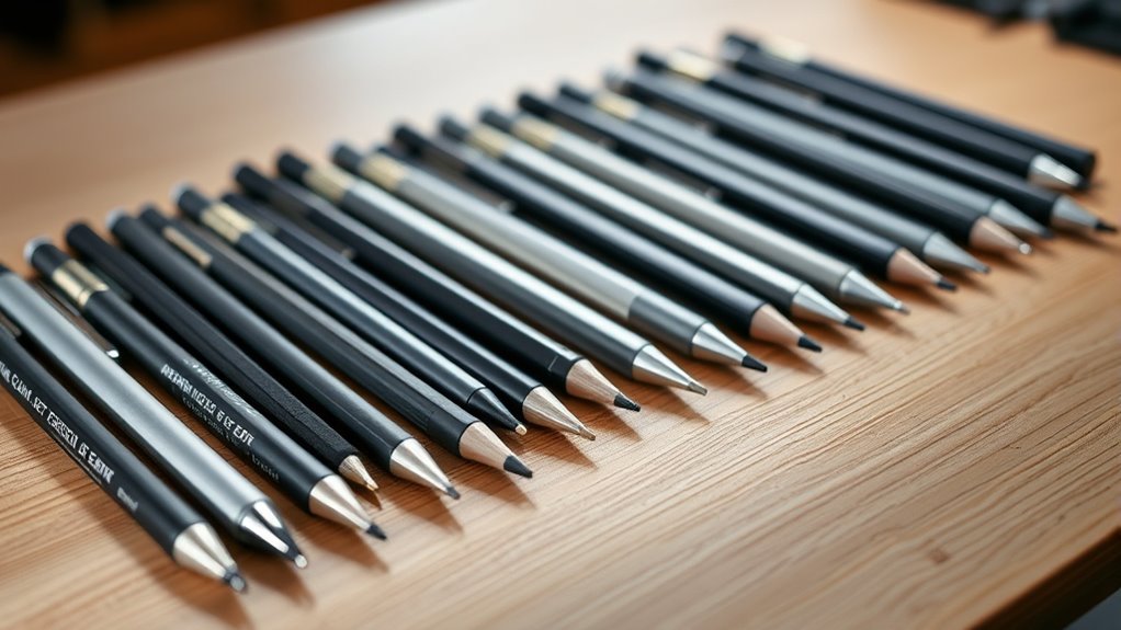 A comfortable grip plays a vital role in achieving precise and consistent lines during drafting. Rubber or textured surfaces reduce hand fatigue during long sessions, helping maintain steady control. Metal or knurled grips enhance grip security, preventing slipping and ensuring line accuracy. Ergonomic shapes, like hexagonal or rounded barrels, improve handling and lessen strain, making extended work easier. Proper grip design allows for better pressure control, which leads to consistent line thickness and smooth shading. The placement and firmness of the grip also affect overall control, especially when working on fine or detailed lines. Choosing a pencil with a grip that feels natural and secure helps improve precision, reduces fatigue, and enhances your overall drafting experience.