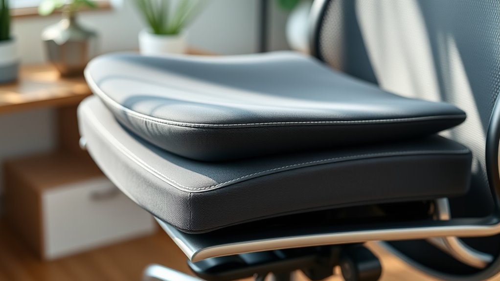 When choosing a memory-foam seat cushion for specific health needs, it’s crucial to take into account how its design can support your condition. If you have tailbone injuries or coccyx pain, opt for cushions with a pronounced U-shaped cutout to reduce pressure directly on your coccyx. For sciatica sufferers, ergonomic cushions that provide targeted support to your lower back and hips can help relieve nerve compression. Those with hemorrhoids benefit from open rear designs and breathable covers, promoting airflow and reducing discomfort during long sitting periods. If you’re at risk of pressure ulcers, prioritize cushions with pressure redistribution features and high-density memory foam to prevent skin breakdown. Always consult your healthcare provider to ensure your cushion’s firmness, shape, and materials match your medical needs.