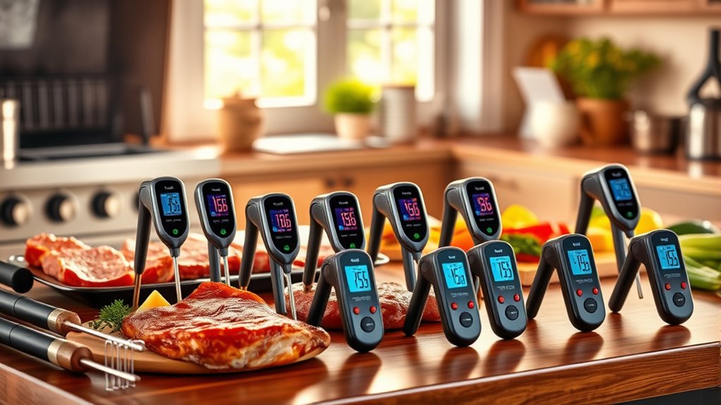 Choosing the right number of probes is essential because it directly affects how many meats or zones you can monitor at once, guaranteeing precise temperature control during complex cooks. Multi-probe thermometers usually have 2 to 6 probes, giving you the ability to track multiple internal temperatures and ambient conditions simultaneously. If you’re cooking multiple dishes or managing different sections of a large cut, more probes offer greater flexibility and accuracy. They also help prevent cross-contamination by keeping each piece of meat monitored separately. Your choice depends on your cooking style, the complexity of your meals, and whether you need to monitor several items at once. Selecting the appropriate number of probes ensures you can manage everything efficiently and achieve perfectly cooked results.