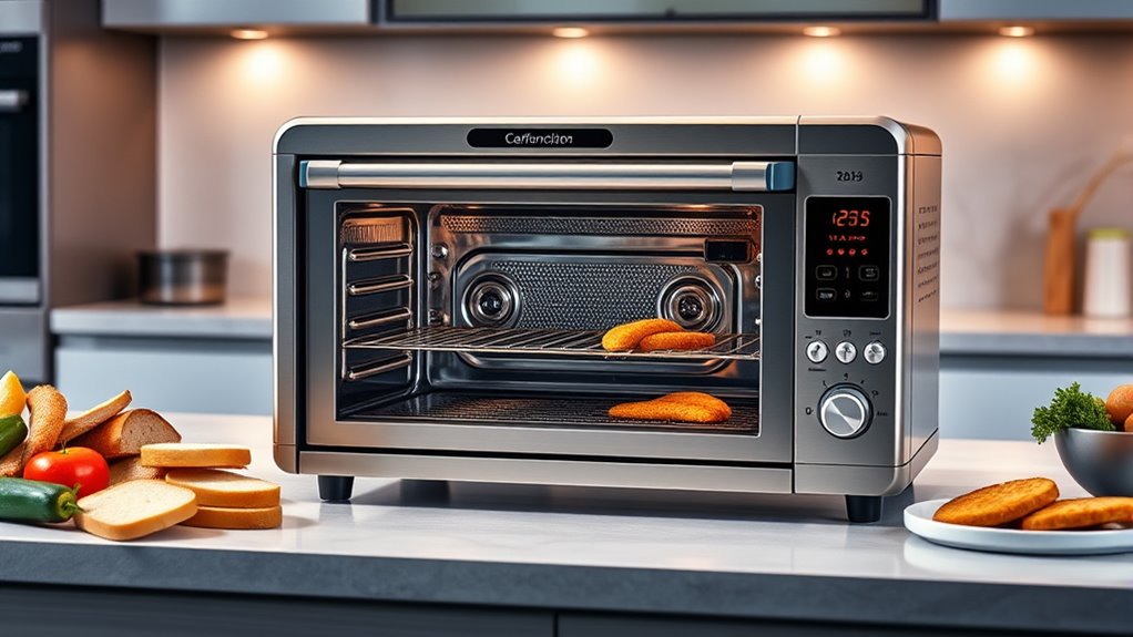 When choosing a multifunction toaster oven with air fryer features, prioritizing safety features is essential to prevent accidents and guarantee peace of mind during use. Look for automatic shut-off functions that turn off the device once cooking is complete, preventing overcooking or overheating. Heat-resistant handles and exterior surfaces are necessary to avoid burns when handling hot food or moving the appliance. Stability is also important; ensure the toaster oven has non-slip feet or a sturdy base to prevent tipping. For households with children, features like cool-touch exteriors and safety lock mechanisms add extra protection. Lastly, always check for safety certifications such as UL or ETL, confirming the appliance meets established safety standards and provides reliable, safe operation.