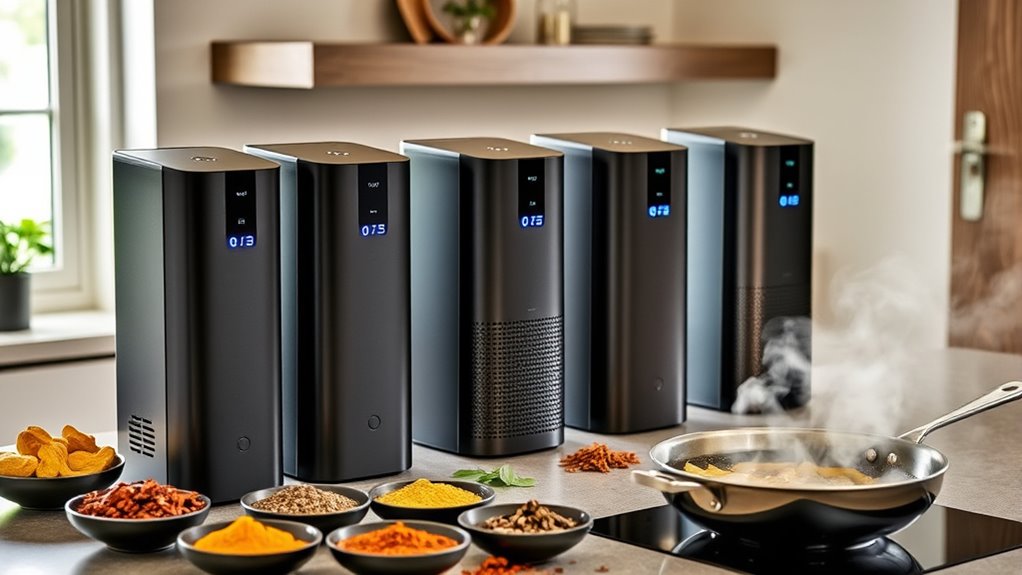 You might think all air purifiers do the job, but for spice odors, look for ones with activated charcoal filters and HEPA filters. These features trap tiny particles and absorb strong smells effectively. I’ve found that models with adjustable fan speeds and odor-specific modes work best, allowing you to tailor the cleanup. Investing in these features guarantees your kitchen stays fresh, even after intense spice cooking sessions.