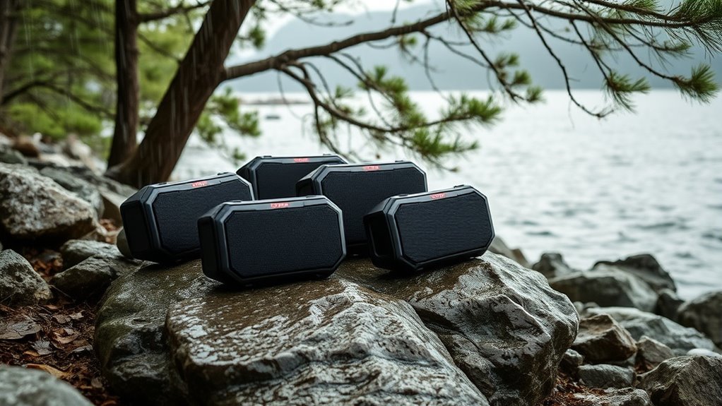 When selecting outdoor waterproof Bluetooth speakers, considering portability and design can make all the difference in how enjoyable and practical your listening experience will be. I recommend choosing a lightweight, compact model with handles or straps for easy carrying during outdoor adventures. Durability is key, so look for speakers with rubberized exteriors or reinforced plastics that can withstand impacts, drops, and rough handling. Waterproof ratings like IPX4 or higher are essential to protect against splashes, rain, and spills. Some models offer mounting options or stands, giving you flexible placement options in various environments. Finally, consider the size and weight to ensure the speaker is suitable for your activities, balancing portability with the sound quality you desire.