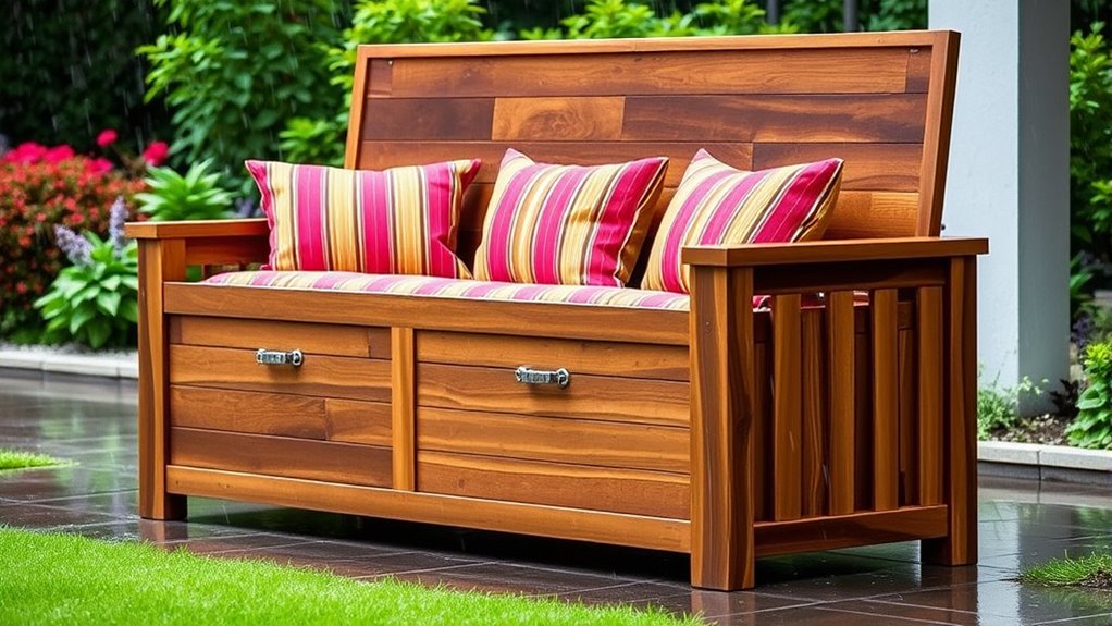 Choosing the right weatherproofing technology is vital to guarantee your outdoor storage bench stays durable and functional over time. I look for benches made from resin, polypropylene, or resin composites because they resist moisture, UV rays, and temperature swings. Reinforced steel or metal framing adds strength, preventing warping or deformation caused by outdoor conditions. Waterproof seals, drainage systems, and gasket-lined lids are essential for keeping water out and protecting stored items from moisture damage. UV-resistant coatings protect surfaces from fading, cracking, and deterioration due to sunlight. Additionally, lockable features and corrosion-resistant hardware ensure security and longevity. Investing in these weatherproofing technologies means your bench will stand up to the elements, maintaining both its appearance and functionality year after year.
