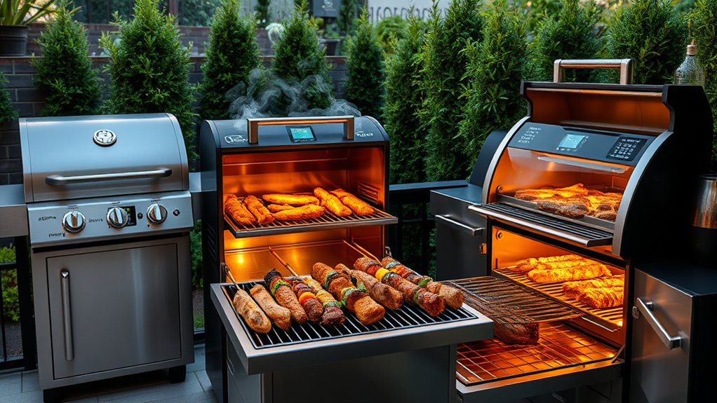 Reliable temperature monitoring is essential because it guarantees that halal meats like chicken and beef reach their safe internal temperatures without overcooking. Built-in meat probes that provide real-time readings for multiple meats help ensure precise doneness, with most grills offering ±5°F accuracy. Digital control panels with LCD displays and PID technology improve temperature stability, preventing fluctuations that could compromise safety or quality. Multiple sensors and probes allow for thorough monitoring during different cooking phases, whether slow smoking or high-heat searing. Additionally, using calibrated thermometers or external monitoring tools can add an extra layer of dependability. Overall, a grill with robust temperature control features ensures consistent, safe results, giving me confidence that my halal meats are cooked thoroughly and safely every time.