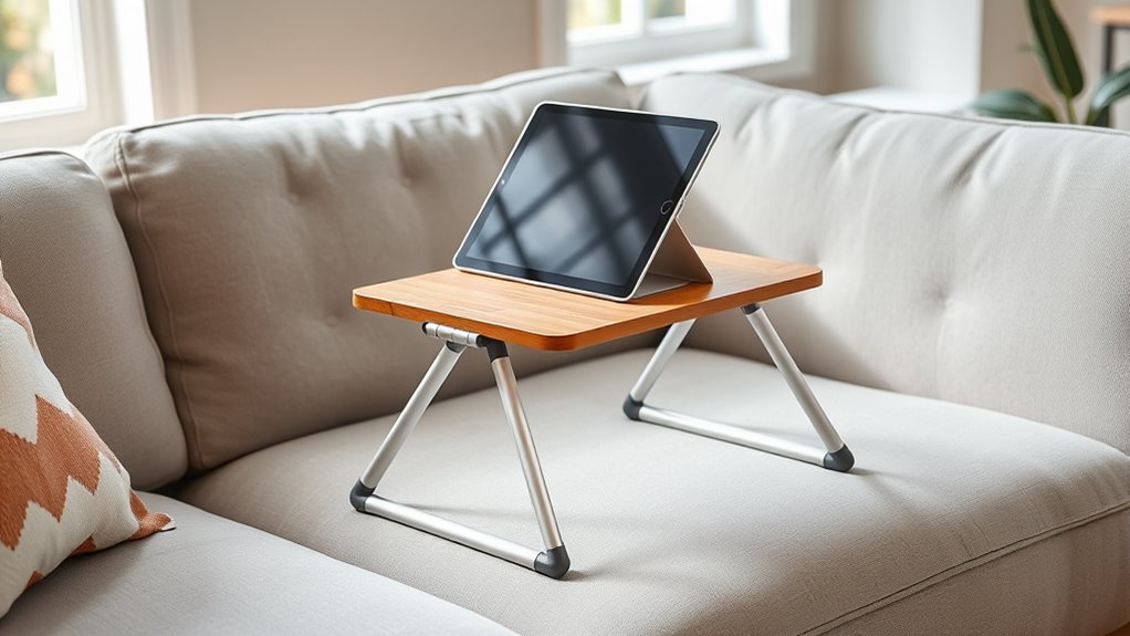 Choosing a portable lapstand with the right adjustability range is essential for guaranteeing comfort and proper ergonomics. Some models offer height adjustments from 2 to 21 inches, providing plenty of flexibility, while others only go from 3 to 6 inches, which might be limiting. Many lapstands feature multiple tilt angles, usually between 15° and 40°, so you can find the most comfortable viewing or working position. The number of adjustable levels varies from as few as 3 to over 9, giving you more customization options. Telescoping or foldable mechanisms enhance versatility, allowing for easy height adjustments and compact storage. Selecting a lapstand with an appropriate adjustability range ensures it can accommodate different body heights and usage scenarios, promoting better posture and sustained comfort.