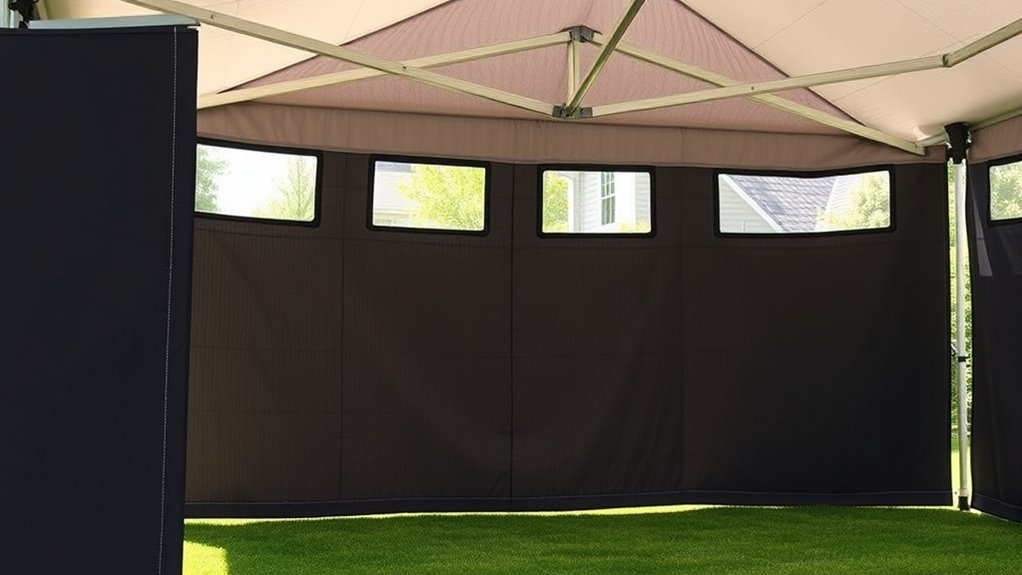 Selecting a premium canopy sidewall kit with windows for your 10×20 setup means prioritizing weather resistance to keep you comfortable and protected. These sidewalls are made from waterproof, UV-resistant materials like polyethylene or polyester with waterproof coatings, ensuring durability against rain, snow, and sun exposure. Seam-welded or heat-sealed seams are essential, as they provide enhanced leak resistance and prevent water ingress. Ventilation features such as roll-up windows and mesh panels help regulate airflow while still offering protection from wind and rain. Proper installation is key; secure attachment systems like Velcro straps and zippers prevent water from seeping in and allow the sidewalls to withstand strong winds. Prioritizing these features guarantees you stay dry, comfortable, and protected in various weather conditions.