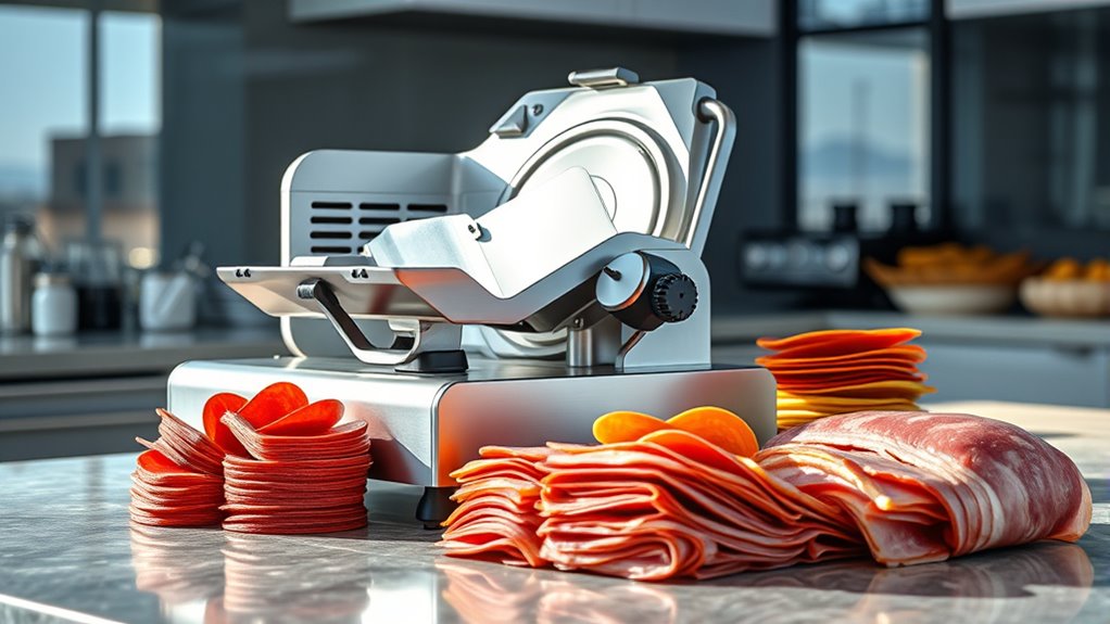 A powerful motor is vital for a premium cold-cut slicer, especially if I want fast, consistent results. Typically, motors rated at 200W or higher deliver quicker slicing speeds and can handle dense or frozen foods without overheating. Slicing speed, measured in slices per minute, varies—commercial models can produce up to 50 slices per minute, but for home use, a balance is key. Faster speeds save time and improve efficiency, but they require enough power to maintain quality and safety. A motor that’s too weak may struggle with tougher meats or cause uneven cuts. Consequently, choosing a slicer with sufficient wattage ensures I get smooth, precise slices without sacrificing safety or performance. It’s about finding that sweet spot between power and speed for ideal results.