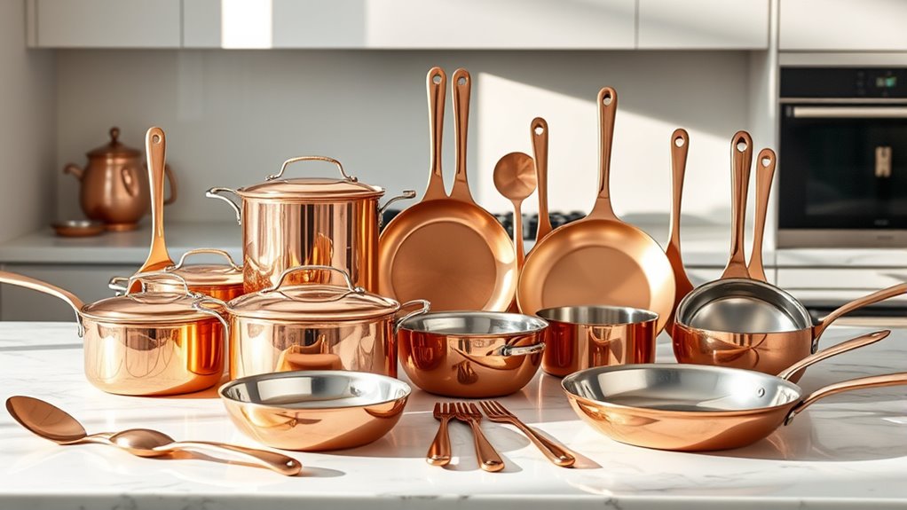 If you’re searching for the 15 best premium copper utensil sets of 2025, I’ve got you covered. These collections combine durability, elegant design, and versatile functionality, featuring high-quality copper, stainless steel, and beautiful finishes like hammered or satin textures. From complete cutlery sets to cookware, each offers a blend of aesthetics and practicality for your kitchen. Stick around, and you’ll discover the top choices to elevate your culinary space with style and quality.