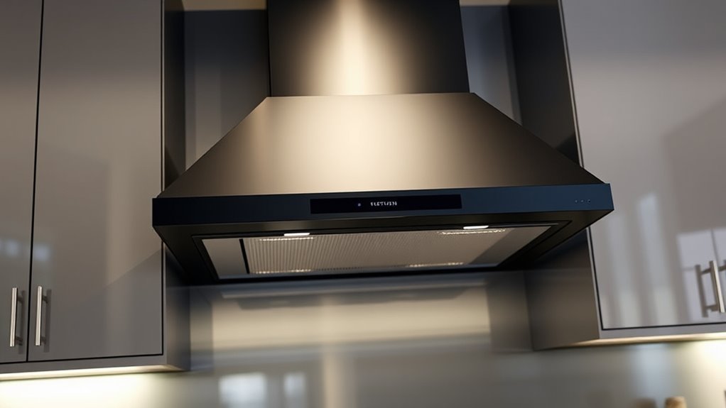 Noise levels can considerably impact your cooking experience, especially if you prefer a quieter kitchen. Range hoods typically produce between 45 dB and over 70 dB, influencing how loud your space feels during use. If you enjoy a peaceful environment or have an open-concept layout, models below 55 dB are ideal, offering quieter operation without sacrificing performance. Keep in mind, higher airflow capacity (CFM) often means more noise, so finding a balance is key. Some hoods come equipped with noise reduction technology or quieter motors, helping you enjoy powerful ventilation without the loud soundtrack. When choosing, check user reviews and product specs for decibel levels at different speeds to ensure the model aligns with your noise preferences—quiet enough for your comfort.