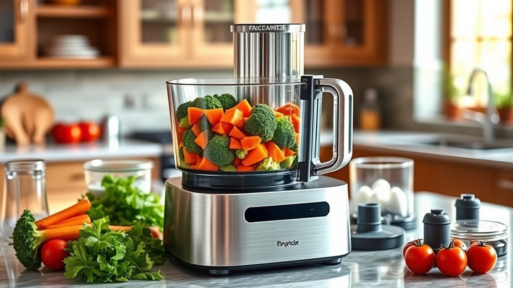I’ve looked into safety features on premium food processors, and I can tell you they’re built with large families in mind. Most include safety locks that prevent operation unless everything’s securely assembled, and auto-shutoff systems if overheating or malfunction occurs. Non-slip bases keep the processor steady during use, reducing accidents. These thoughtful features let me cook confidently, knowing my family’s safety is prioritized while I prepare meals efficiently.
