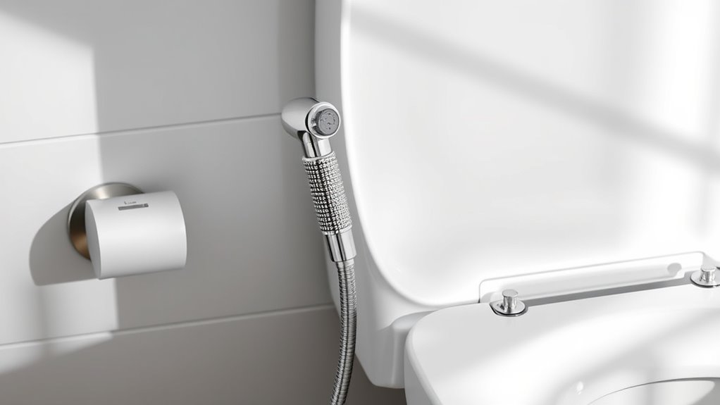 Did you know that over 60% of users repurpose their bidets for cleaning other household items? Yes, premium handheld bidet sprayers are versatile; I often use mine to rinse cloth diapers, clean the toilet bowl, or even wash small pet paws. They’re not just for personal hygiene—they’re practical tools for various cleaning tasks around the home, making them a smart, eco-friendly addition to your cleaning arsenal.
