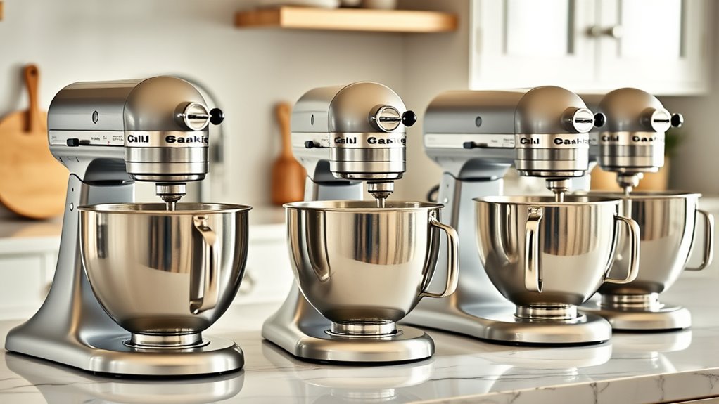 Absolutely, these mixers can handle diverse dough types beyond baking. I’ve used mine for bread, pizza, pasta, and even heavy cookie dough. Their powerful motors and sturdy construction make it easy to mix thick or sticky doughs without straining. Just guarantee you select the right speed and attachment, and you’ll find these mixers versatile enough for all your dough needs, no matter how challenging.
