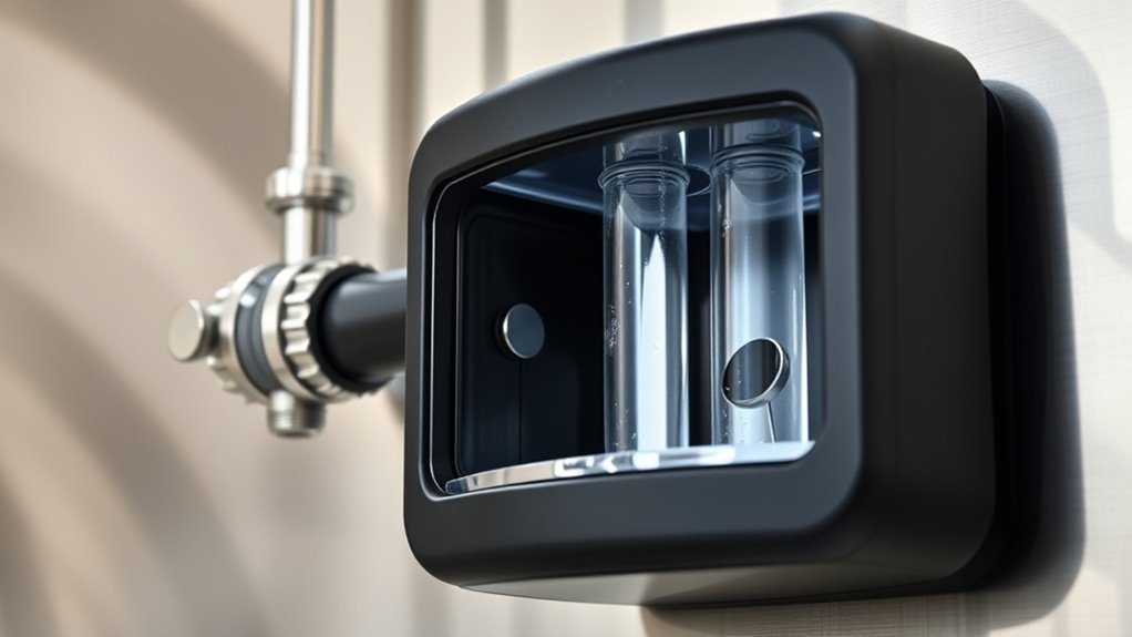 When evaluating a salt-free whole-house conditioner, it’s essential to take into account how well it preserves your water’s natural mineral balance. A good system maintains beneficial minerals like calcium and magnesium, ensuring your water stays healthy and tastes right. Since these conditioners don’t add or remove chemicals, your water quality remains consistent and free from unwanted contaminants. Unlike traditional softeners that introduce sodium, salt-free systems keep your water’s original composition intact. Additionally, high-quality units often feature filtration components, such as pre-filters, that remove sediments and impurities, boosting clarity and purity. Properly chosen systems prevent scale buildup without stripping essential minerals, promoting healthier water for your household without compromising natural mineral content.