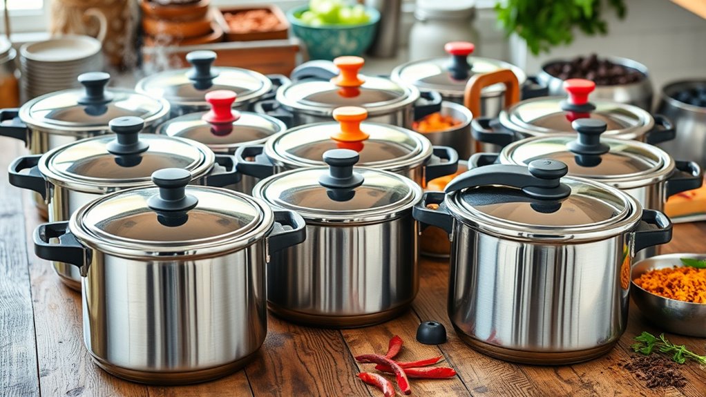 Safety features are essential to guarantee your pressure cooker operates reliably and prevents accidents during cooking, especially with flavorful biryani. Look for models with multiple safety valves, like pressure release valves and overpressure protection, to avoid accidental over-pressurization. A secure locking lid that can’t be opened until pressure drops to a safe level is vital. Also, check for safety indicators, a safety lock mechanism, and automatic pressure release to ensure safe operation. Gasket release systems and safety plugs that activate if pressure exceeds limits add extra protection. Finally, prioritize pressure cookers with clear safety certifications, such as ISI or UL, confirming they meet safety standards. These features give me confidence that the cooker will perform safely, even during intense cooking sessions.