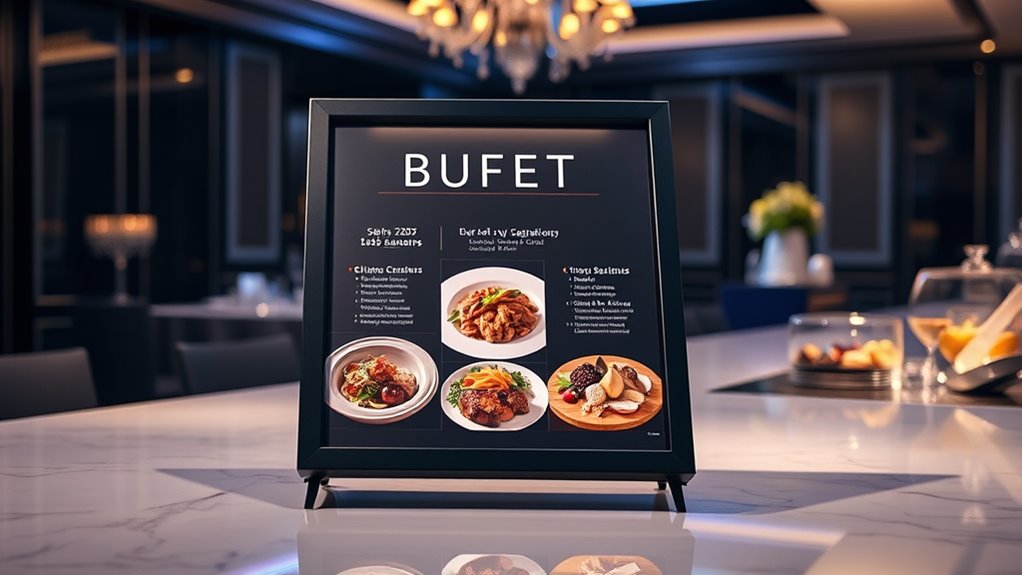 Choosing the right buffet signage stand can subtly elevate your event’s ambiance, guiding guests effortlessly without overpowering the decor. With so many stylish options available, you’re bound to find one that complements your theme perfectly. Remember, the right stand isn’t just functional — it’s like the gentle whisper that keeps everything flowing smoothly. Trust your instincts, and soon your event will feel both polished and welcoming, leaving a lasting impression on all who attend.