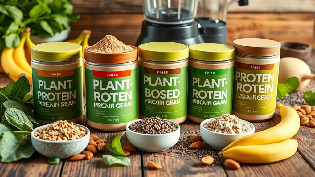 Achieving a balanced nutritional profile in plant-based protein powders means choosing products that deliver a complete set of amino acids essential for muscle repair and overall health. Look for powders that combine diverse plant proteins like peas, rice, chia, hemp, or pumpkin seeds, ensuring you get all nine essential amino acids. A good protein powder should provide about 15-25 grams of protein per serving, enough to support your daily needs without excess. Adding prebiotic fibers, such as inulin or chia seeds, can boost gut health and improve nutrient absorption. It’s also important to choose products with low added sugars and artificial ingredients to maintain a clean, health-conscious profile. Balancing these factors helps maximize benefits and aligns with your fitness and wellness goals.