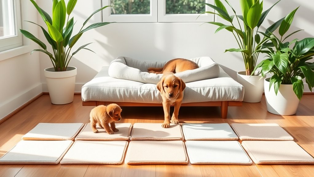Choosing the right absorbency level in puppy training pads is essential for keeping your home clean and odor-free. Higher absorbency pads can hold more liquid, which means fewer changes and less chance of leaks. I’ve found that pads with superior absorbency quickly turn urine into gel, preventing any seepage and keeping your floors dry. When choosing, look for pads that support 4-6 cups of liquid or more, especially if your dog tends to urinate heavily. Adequate absorbency not only helps avoid messes but also traps moisture, reducing odors and the risk of yellow stains and bacteria. For larger dogs or those that pee frequently, selecting high-absorbency pads is a must to simplify housebreaking.