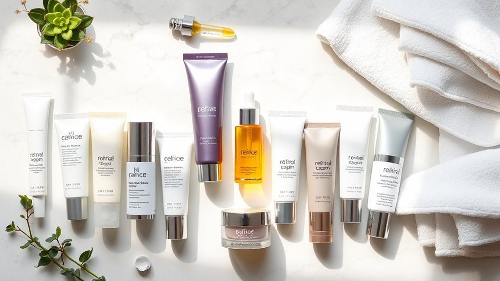 Choosing the right retinol cream can feel overwhelming, especially with so many options available at drugstores. It’s vital to pick a formula that matches your skin type. For oily skin, I recommend oil-free options that won’t clog pores. If you have sensitive skin, go for lower concentrations, like 0.1% to 0.3%, and look for calming ingredients like niacinamide or aloe vera. Acne-prone skin types should seek non-comedogenic products to prevent breakouts. For those with dry or mature skin, creams enriched with humectants like hyaluronic acid or glycerin can boost moisture retention. Always check product labels for skin type recommendations and ingredient lists to guarantee compatibility and minimize irritation risks. Your skin deserves the best!