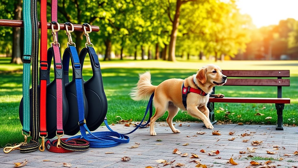 I believe retractable leashes can be risky for aggressive dogs. They offer less control, which can lead to dangerous situations if your dog reacts unexpectedly. I’ve seen how quickly a dog can bolt, pulling the leash and creating chaos. For aggressive dogs, I’d recommend a sturdy non-retractable leash that gives you more control. It’s important to prioritize safety and guarantee you can manage your dog effectively during walks.