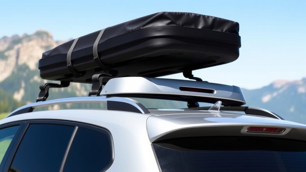 When shopping for a soft shell roof cargo carrier, making certain it’s compatible with your vehicle’s roof type and structure is essential. First, check if your vehicle has crossbars, side rails, or no racks at all, and choose a carrier designed to work with that setup. Measure your roof’s dimensions—length, width, and height—to guarantee the carrier will fit properly without overhanging or being too small. Pay attention to the mounting system, whether it uses door hooks, straps, or rack attachments, and confirm it can securely attach to your specific roof type. Also, verify that the carrier’s weight capacity aligns with your vehicle’s roof load limits to avoid damage. If your vehicle has features like a panoramic or glass roof, consider special installation requirements or potential incompatibility.