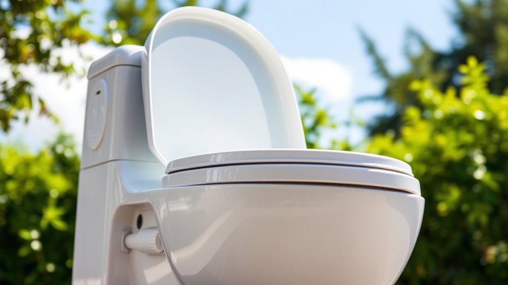 Yes, there are eco-friendly options for portable RV toilets with bidets. I’ve found models that use biodegradable waste bags or composting systems, which reduce water use and environmental impact. Some also feature sustainable materials and energy-efficient designs. Choosing these eco-friendly options helps you minimize your footprint while enjoying the comfort of modern bidet features. It’s a smart way to stay green and comfortable on the road.