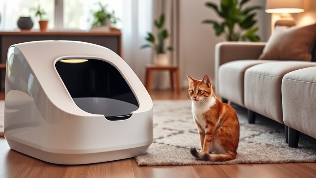 While exploring self-cleaning litter boxes, I quickly realized that effective odor control is a top priority for keeping my home fresh. I found that many models feature sealed waste compartments, which are vital for containing unpleasant smells. Activated carbon filters and odor-absorbing gels also work wonders in minimizing odors. Some boxes even include automatic deodorizing systems that release scent tablets after each cleaning cycle, ensuring a consistently fresh environment. I love that airtight waste bins with silicone seals prevent odors from escaping, even during extended use. Choosing the right litter type, like clumping or silica-based options, enhances odor control too. Of course, regular maintenance—like emptying bins and replacing filters—is essential for sustaining effectiveness.