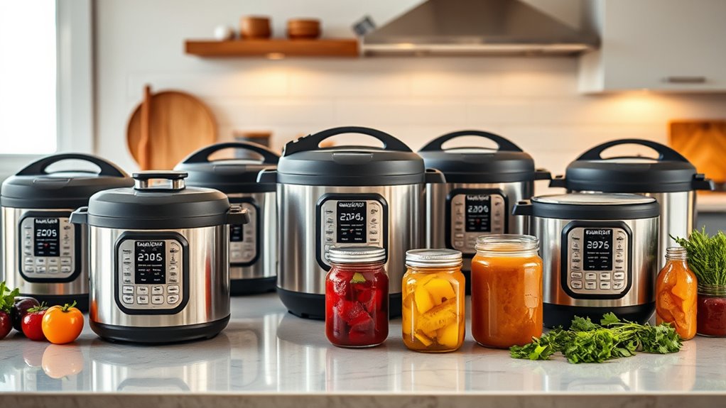 Automation and controls considerably enhance the ease of operating a smart electric pressure canner. With digital displays and preset programs, I find it much simpler to follow each step, reducing guesswork. Precise temperature and pressure regulation happen automatically through sensors, which means I don’t need to manually adjust settings—especially helpful during high-altitude canning for safety. Many models feature automatic pressure release and safety alerts, notifying me of incomplete processes or potential issues, giving peace of mind. Digital controls also include timers and step-by-step prompts, ensuring my results are consistent and minimizing errors during complex tasks like pressure and boiling water canning. Plus, some canners allow remote monitoring and adjustments via mobile apps, offering unmatched convenience and control over my preserving process.