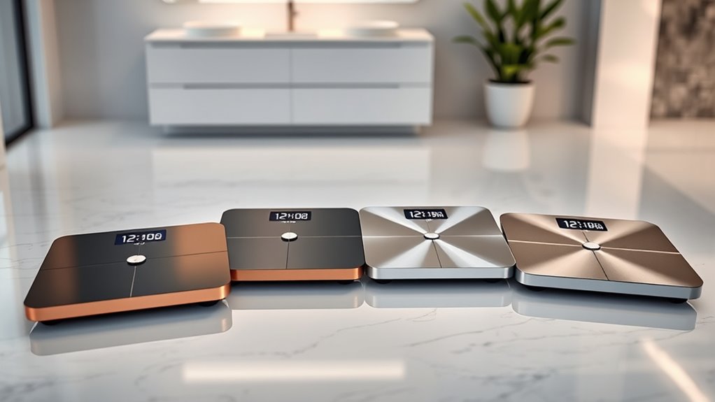 Choosing a smart scale with accurate body composition measurements hinges on the quality of its sensors and technology. High-quality sensors, like multiple electrodes and dual-frequency BIA technology, are essential for precise readings. These scales typically offer small measurement increments, around 0.05 kg (0.1 lb), allowing for detailed tracking. However, factors such as hydration levels, time of day, and skin contact quality can cause variability, so consistency in your measurement conditions is key. To get reliable data over time, try to weigh yourself under similar circumstances regularly. Keep in mind that while many scales deliver professional-grade estimates for metrics like body fat and muscle mass, these are still estimates and may differ from clinical assessments. Ultimately, sensor quality and consistent use guarantee the best accuracy.