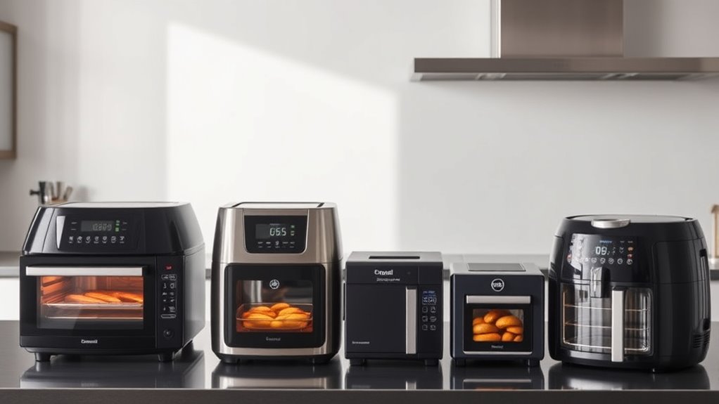 Most models include safety features like automatic shut-off, temperature controls, and cool-touch exteriors to prevent burns. Some also have safety locks to secure the door during operation and overheat protection to avoid overheating. I always recommend checking each model’s specifications to guarantee it has the safety features that match your needs. These features give me peace of mind while cooking, knowing I’m protected from potential hazards.