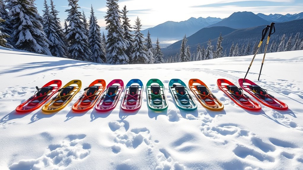 When I’m out snowshoeing, having the right accessories makes all the difference in my experience. Versatile snowshoe kits usually come with adjustable trekking poles that include multiple terrain attachments like snow and mud baskets. This adaptability is vital when conditions change. I love being able to customize my pole length using flip locks or twist locks, which provides stability and comfort whether I’m hiking or snowshoeing. Accessories like padded straps and ergonomic grips enhance my performance, especially on icy or muddy trails. Quick-adjust mechanisms are a game changer, allowing me to adapt my poles effortlessly on the go. Plus, extensive accessory sets, including carrying bags, boost the overall convenience for all my outdoor adventures.