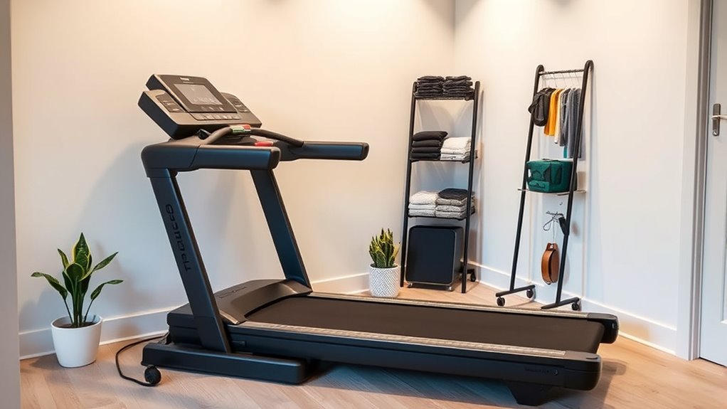 To maximize space efficiency, look for treadmills with foldable designs and wheels that make storage and movement straightforward. A foldable treadmill allows you to easily collapse it after use, freeing up valuable space. Wheels enable quick repositioning without heavy lifting, especially important in tight areas. Choose models with compact dimensions—under 50 inches in length and width—to fit under furniture or in closets. A quick, tool-free folding mechanism simplifies setup and storage, saving time and effort. Additionally, lightweight options, typically below 50 pounds, are easier to maneuver. Built-in handles or grips can enhance stability and control during transportation, reducing strain. Prioritizing these features guarantees your treadmill remains accessible and space-efficient, seamlessly integrating into your small home gym.