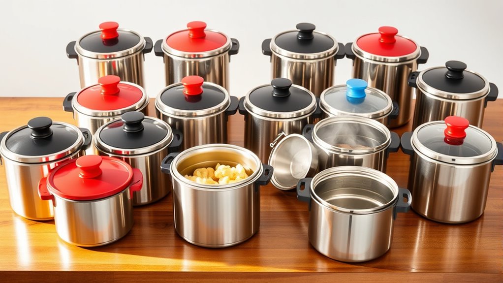 I’ve explored many vacuum-insulated thermal cookers, and I can recommend some top options like the Tayama 7 Qt., Thermos Shuttle Chef 4.5L, and Sunpentown 6L models that keep food hot for hours thanks to excellent heat retention and durable construction. Their features include sturdy handles, leak-proof lids, and lightweight designs perfect for travel or daily use. If you want to discover more about these reliable cookers, stay with me to learn all the details.