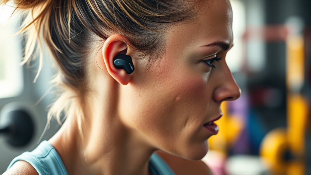 Have you ever had earbuds slip out during an intense workout? It’s frustrating and can disrupt your rhythm. That’s why secure fit stability is essential. Look for earbuds with over-ear hooks, adjustable ear tips, or ergonomic designs—they help keep everything in place, even during jumping or sprinting. Waterproof and sweatproof ratings like IPX7 or IP68 also improve grip by keeping your ears dry and ensuring a snug fit. Multiple tip sizes or customizable fittings are a game changer, reducing slippage caused by sweat or rapid head movements. Plus, lightweight earbuds that fit snugly without causing discomfort help maintain stability during long sessions. Prioritizing these features ensures your earbuds stay put, so you can focus on crushing your workout without distractions.