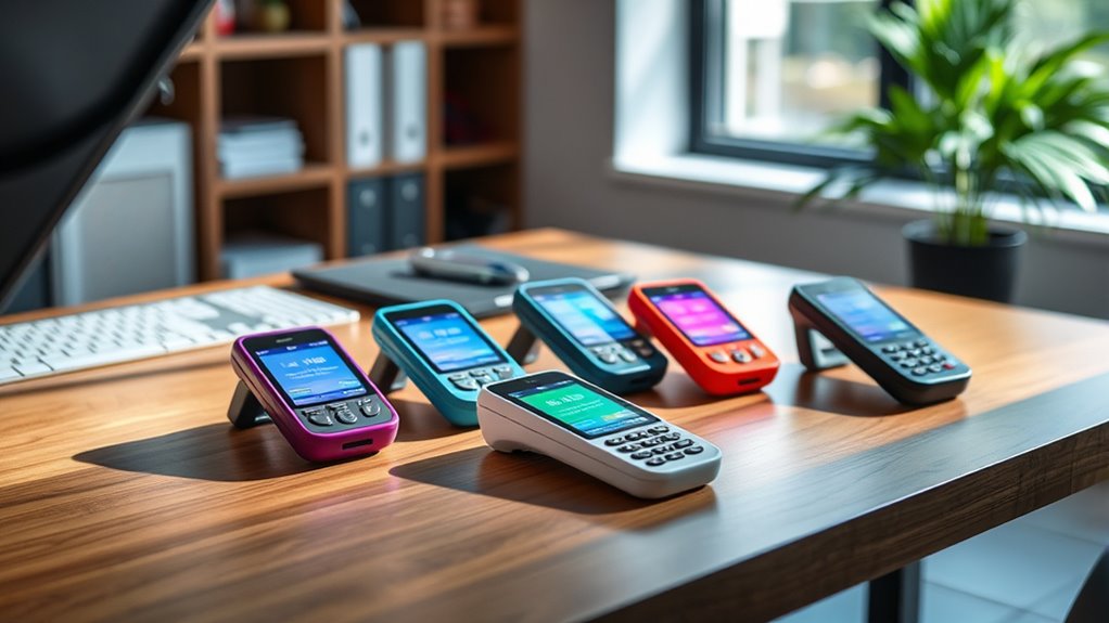Choosing a handheld label maker means considering how portable and easy to handle it is, especially if I plan to use it on the go. Wireless models are designed to be compact and lightweight, usually weighing under 1.5 pounds, making them simple to carry around. Their small size, typically around 4 to 7 inches long and 2 to 4 inches wide, allows for one-handed operation and quick storage in pockets, backpacks, or toolkits. Many feature built-in rechargeable batteries, so I can use them cordless for extended periods without needing an external power source. The ergonomic design, with contoured grips and minimal bulk, enhances comfort and ease of use. These factors guarantee I can label efficiently anywhere, whether at home, in the office, or on-site.