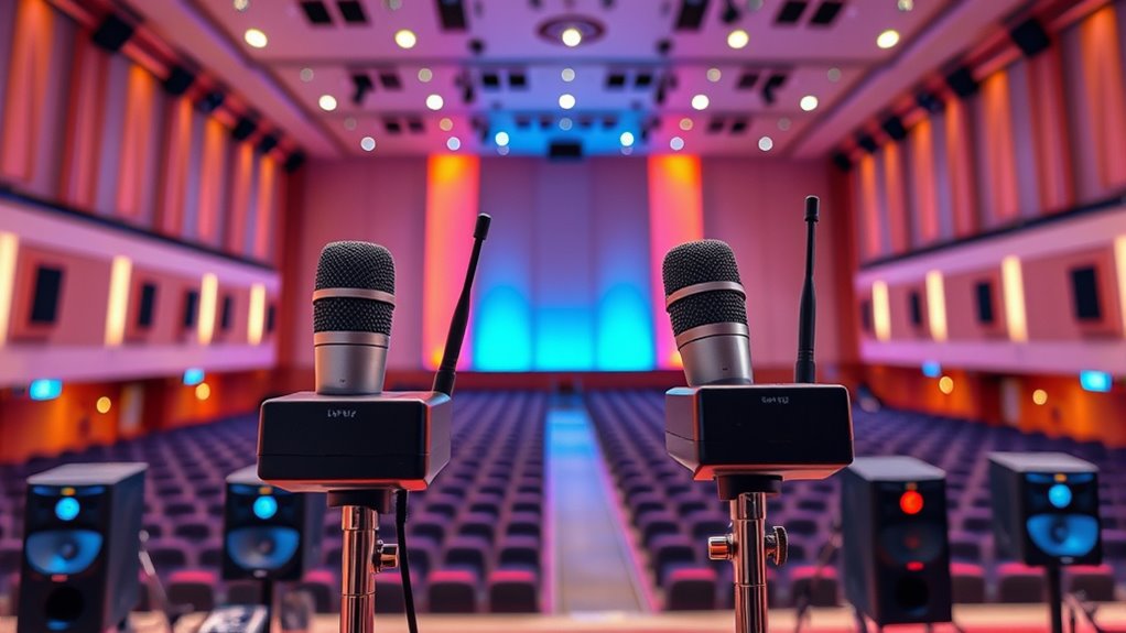 Achieving high sound quality in a wireless microphone system hinges on several key factors that directly impact clarity. First, look for a signal-to-noise ratio of at least 60 dB to ensure background noise stays minimal, making vocals clear and intelligible. A wide frequency response, up to 15-18 KHz, captures the full range of sounds for natural, detailed audio. Low distortion levels, below 0.5%, prevent muddiness, preserving sound integrity during performances. Stable wireless transmission with latency under 10 milliseconds is crucial for sync and real-time clarity. Additionally, proper microphone polar patterns, like cardioid or supercardioid, help reject ambient noise and feedback, especially in complex acoustic environments. Prioritizing these factors guarantees crisp, clear sound in large hall settings.
