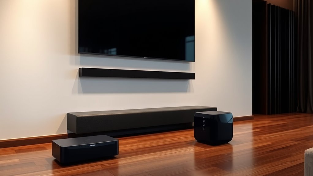 Ensuring your wireless subwoofer soundbar combo works smoothly with your existing devices starts with checking compatibility. First, make sure the soundbar and subwoofer support the same wireless standards, like Bluetooth or Wi-Fi, for easy pairing. Verify that the system is compatible with your TV’s input options—HDMI ARC, optical, or AUX—to match your current setup. It’s also helpful if the system connects effortlessly to other devices such as smartphones, tablets, or gaming consoles via Bluetooth or Wi-Fi, offering versatile use. Additionally, check if the system’s frequency response and power output suit your room size and listening preferences. Finally, consider whether you can control multiple devices through a single remote or app, simplifying integration across your entertainment ecosystem.