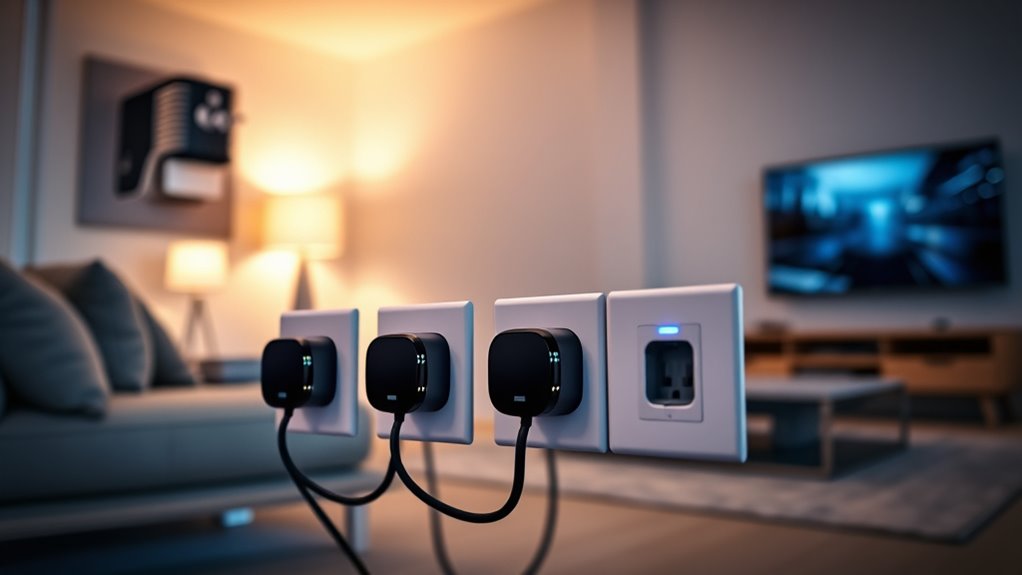 Understanding the network range and signal strength of Z-Wave smart plugs is essential for reliable performance throughout your home. The effective range varies by model; Long Range (LR) devices can reach up to 1300 feet outdoors, while standard Z-Wave devices typically cover 50-100 feet indoors. Since Z-Wave operates as a mesh network, each device relays signals, extending coverage and improving communication. Proper placement is vital—devices need to be within direct range of the hub or other nodes to avoid dead zones. Obstacles like walls, metal objects, and appliances can weaken signals, so strategic placement or adding repeaters can boost coverage. Using compatible extenders ensures seamless control across larger or multi-story homes, maintaining a strong, stable network.